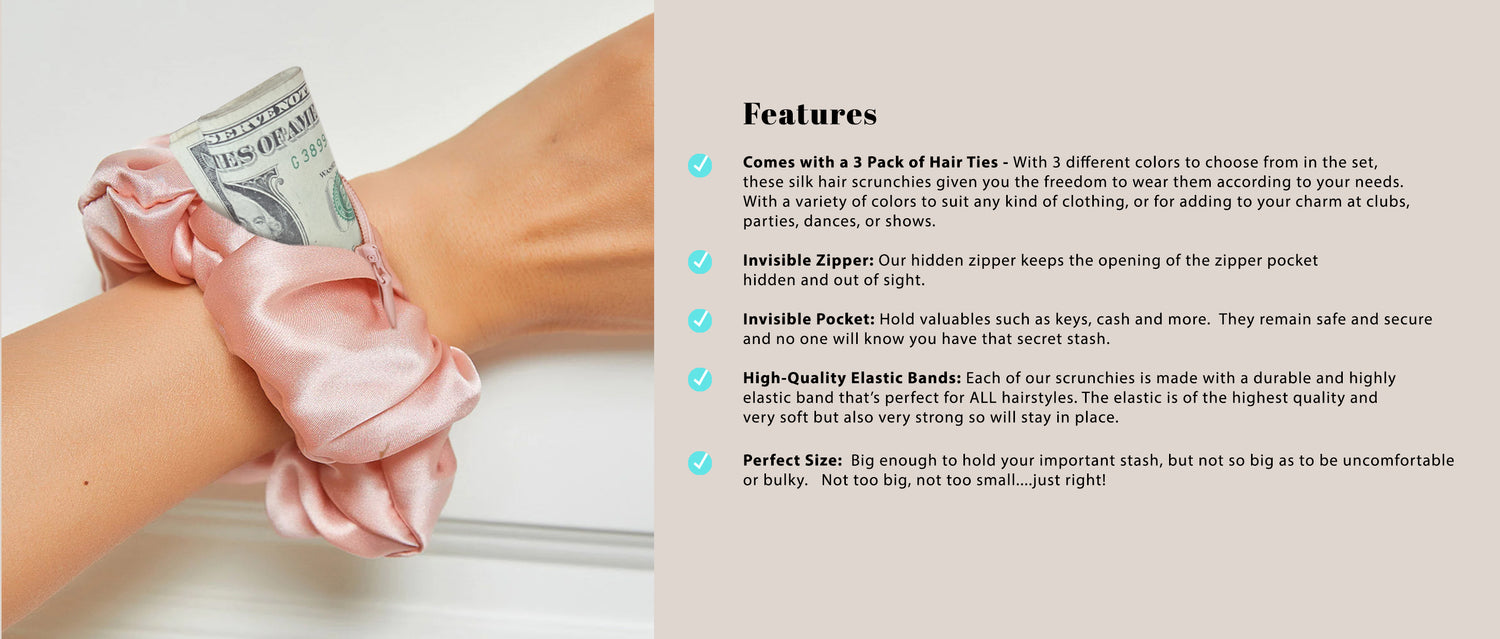 Our 100% Mulberry Silk Hidden Pocket Secret Stash Scrunchie combines trendy style with a hidden secret that will revolutionize the way you carry your valuables. Say goodbye to bulky wallets and clunky purses, and hello to the ultimate accessory that keeps your essentials safe and sound. Regular Scrunchies only hold your hair. Our Hidden Pocket Scrunchies also hold your valuables!